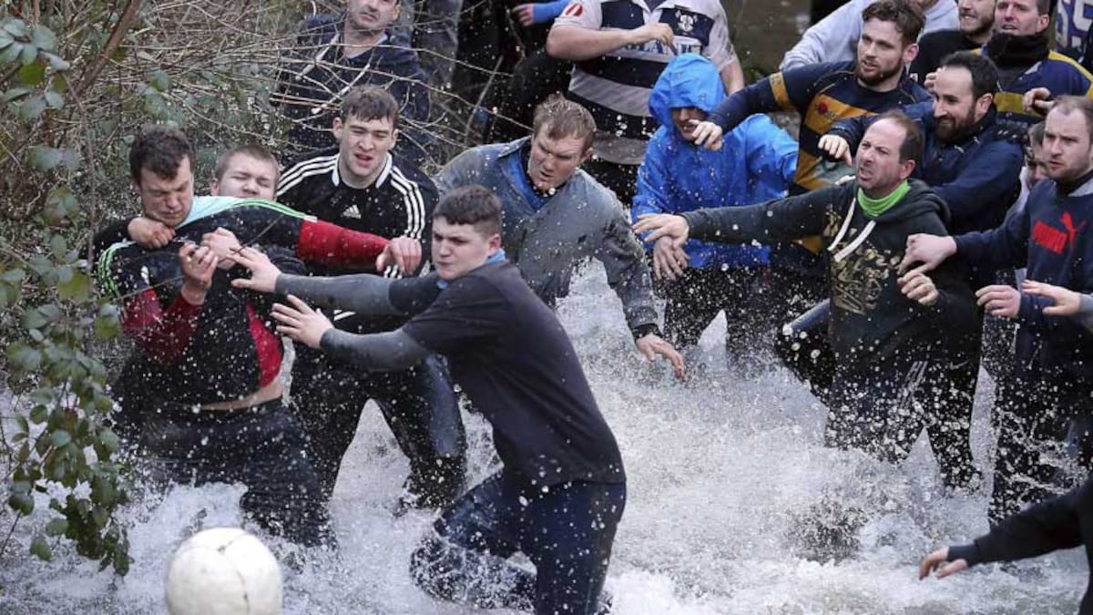 Se conoce como Royal Shrovetide Football (fútbol real de carnestolendas) pero poco tiene que ver con el deporte rey. En verdad se remonta al origen del juego, del que derivan el fútbol moderno o el rugby, y nadie sabe a ciencia cierta desde cuándo se disputa este partido que divide a los habitantes de Ashbourne, una población del centro de Inglaterra, aunque hay pruebas de que ya se disputaba en el siglo XII. Los casi cinco kilómetros que separan dos antiguos molinos se convierten durante dos días (el Martes de Carnaval y el Miércoles de Ceniza) en una batalla que puede prolongarse hasta 16 horas y enfrenta a los Up'ards y los Down'ards, los nacidos al norte o al sur del río Henmore. Pero en realidad cualquiera es bienvenido puesto que todo el mundo ha nacido más arriba o más debajo de ese río que cruza la población, así que los equipos cuentan con cientos de jugadores, sin contar con la multitud de espectadores que atrae.