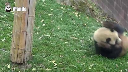 Uno de los pandas gigantes del centro de investigación y cría de estos animales de Chengdu, en Sichuan (China), es el protagonista de unas divertidas imágenes que están dando la vuelta al mundo. El vídeo difundido por la página IPanda muestra al mamífero revolcándose por el césped como una bola. Los pandas gigantes viven en las montañas altas de China, donde crece el bambú del que se alimentan. La desaparición de su hábitat natural, la caza y sus particulares características de reproducción —la hembra entra en celo solo una vez al año y puede ser fecundada por el macho durante dos o tres días— hacen que este animal esté en peligro de extinción. Quedan unos mil ejemplares.