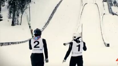 El equilibrio y la coordinación de dos deportistas eslovenos, Rok Urbanc y Jaka Rus, en su salto de esquí en tándem en las pistas de Planica (Eslovenia), han logrado el objetivo que perseguían: un salto de récord a unos 35 metros de distancia. La hazaña tuvo lugar la semana pasada y, según los organizadores, hasta ahora nunca dos esquiadores habían saltado unidos por los mismos esquíes, lo que les garantizaba la plusmarca con solo aterrizar el salto, aunque ninguna institución oficial acudió para registrarla.