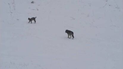 Primero se cruzan y luego se observan, pero cada animal adopta una postura diferente en las montañas nevadas de los Cárpatos, en Polonia. Si la del lobo es acercarse en primera instancia, la de la lince es atacar, lo que provoca la huida del cánido. El lobo solo pretendía jugar, pero la felina reaccionó así para defender a sus crías, con las que se encontraba en ese momento. Así lo ha explicado el biólogo y autor del vídeo, Zenek Wojtas, que asistió a este excepcional encuentro entre los antepasados de los perros y los gatos y cuyo vídeo ha divulgado la ONG WWF con motivo de la campaña Revive tu naturaleza.