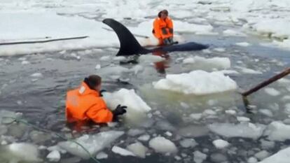 Con una barca, moviendo bloques de hielo con varas y hasta con las manos. El Ministerio de Emergencias ruso ha mostrado en un vídeo el rescate de un grupo de orcas que quedaron atrapadas frente a la costa de la isla de Sajalín (sureste). Cuatro mamíferos de esa especie cayeron en una trampa de aguas heladas y poco profundas a menos de 100 metros de la costa. La poca profundidad y la presencia de grandes rocas impiden la navegación en esa zona, así que era imposible llegar con un rompehielos. Para llegar hasta las orcas fue necesaria una barca manejada con pértigas. Una vez allí, la labor consistió en apartar el hielo que las bloqueaba para que pudieran moverse hasta aguas abiertas. La operación funcionó con tres de los animales, incluyendo una cría. La cuarta orca, que había quedado varada sobre una piedra, tuvo que esperar a la subida de la marea para poder ser arrastrada. Aunque en ese tiempo no estuvo sola, los equipos de rescate la protegieron del hielo para evitar que se congelase.