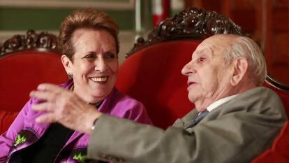 El oficial del Ejército republicano Fernando Rodríguez Miaja, de 98 años, y la presidenta del Ateneo Español en México, Carmen Tagüeña, dialogan sobre la huella del éxodo español