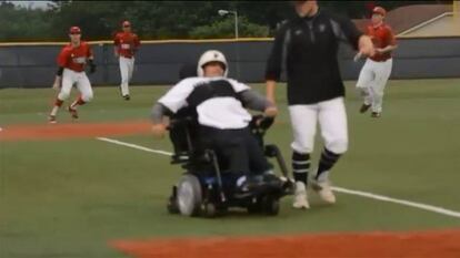 En el vídeo el estudiante de bachillerato, en silla de ruedas, anota una carrera para el equipo texano Mesquite Poteet