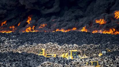 El incendio del vertedero de Seseña obliga a evacuar la urbanización de ‘El Pocero’. Un gran incendio desatado esta madrugada en el cementerio de neumáticos de Seseña, el más grande de Europa, ha consumido más de un 80% de las 11,4 hectáreas que ocupa el vertedero. El fuego ha comenzado en torno a las 2.00 horas en la zona situada en Valdemoro (Madrid) y ha generado llamas de hasta 20 metros de altura y una nube tóxica que se ha propagado por el viento. En 2003, el vertedero fue declarado ilegal por no respetar las normas medioambientales.