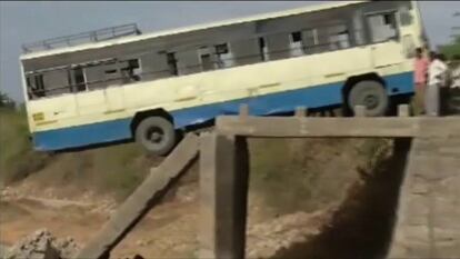 Un autobús de pasajeros sufrió un accidente al desplomarse el puente sobre el que estaba cruzando en la localidad de Junagadh, al noroeste de India. Según informa la agencia asiática ANI, el vehículo, que llevaba 25 viajeros, se quedó colgando, lo que permitió a los pasajeros poder ser evacuados antes de que pudieran sufrir algún daño.