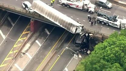 Un camión se quedó colgando de un puente tras un accidente en una autopista en el Bronx, en la ciudad de Nueva York. Las principales vías quedaron colapsadas al cerrarse al tráfico ese tramo de la carretera. El vídeo, captado desde un helicóptero, muestra lo cerca que estuvo el accidente de convertirse en una catástrofe. Por suerte no ha dejado ninguna víctima mortal, ni siquiera en el vehículo que arrolló el camión, del que salieron todos ilesos.