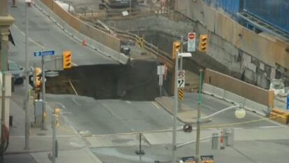 Un agujero de unos cinco metros engulló este miércoles parte de la calle Rideau, en Otawa (Canadá). El derrumabiento provocó solo daños materiales, pero fue necesaria la evacuación de un hotel, un palacio de congresos y un centro comercial. Además, una camioneta y un poste de luz fueron arrastrados al fondo. "No hay que lamentar víctimas, ni tampoco personas desaparecidas", declaró Jim Watson, alcalde de la ciudad. Según las autoridades, el derrumbamiento se produjo por la ruptura de una tubería, aunque se sospecha que la construcción de una línea de metro cercana también pudo haber influido, informan medios locales. La calle Rideau es una arteria muy transitada a diario y se encuentra a pocos metros del Parlamento y de la oficina del primer ministro canadiense.