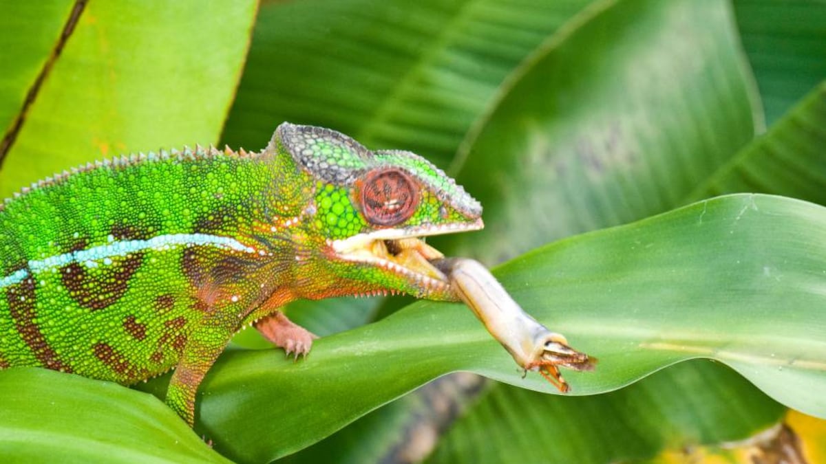 Una nueva investigación arroja luz sobre los mecanismos empleados por los camaleones a la hora de capturar a sus presas. Este animal se alimenta de una amplia variedad de animales vertebrados e invertebrados, desde hormigas hasta langostas, grillos o lagartijas. Durante su rutina de caza, permanece escondido e inmóvil a la espera de detectar una presa activa dentro de su rango de ataque. Una vez detectado un objetivo, lanza su lengua a modo de proyectil, y puede alcanzar distancias equivalentes hasta a dos veces su propio cuerpo. Cuando la lengua está en contacto con la presa, se inicia un movimiento de retracción muy rápido, de nuevo hacia la boca, según el estudio, publicado en Nature Physics.