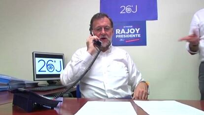 En Málaga, Mariano Rajoy llamó por teléfono a un militante de su partido para charlar con él unos minutos. La escena se desarrolló en la sede del PP en dicha ciudad el lunes 20 de junio. El presidente del Gobierno en funciones ha basado su campaña en el voto útil y en el acercamiento a la gente. Esto le ha llevado a realizar actividades de campaña como esta.