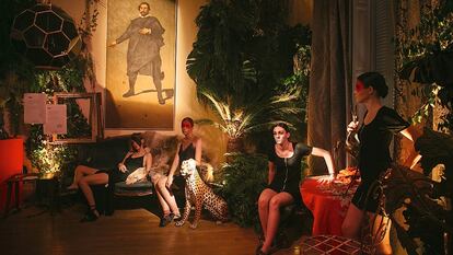 Un palacio abandonado engullido por plantas tropicales. Las esparragueras devoran las paredes, los helechos se adueñan del suelo y las palmeras decoran las esquinas. Huele a falsa pimienta, hiedra, ficus. Las cortinas de terciopelo y los sillones de escay aportan el toque retro. De golpe, el visitante descubre un guepardo en el suelo del salón. No estamos de visita por alguna casona del África colonial, sino en el madrileño barrio de Salamanca, concretamente en el palacio de Saldaña. Y el felino no sufre la humedad de los vaporizadores porque… es de cerámica.