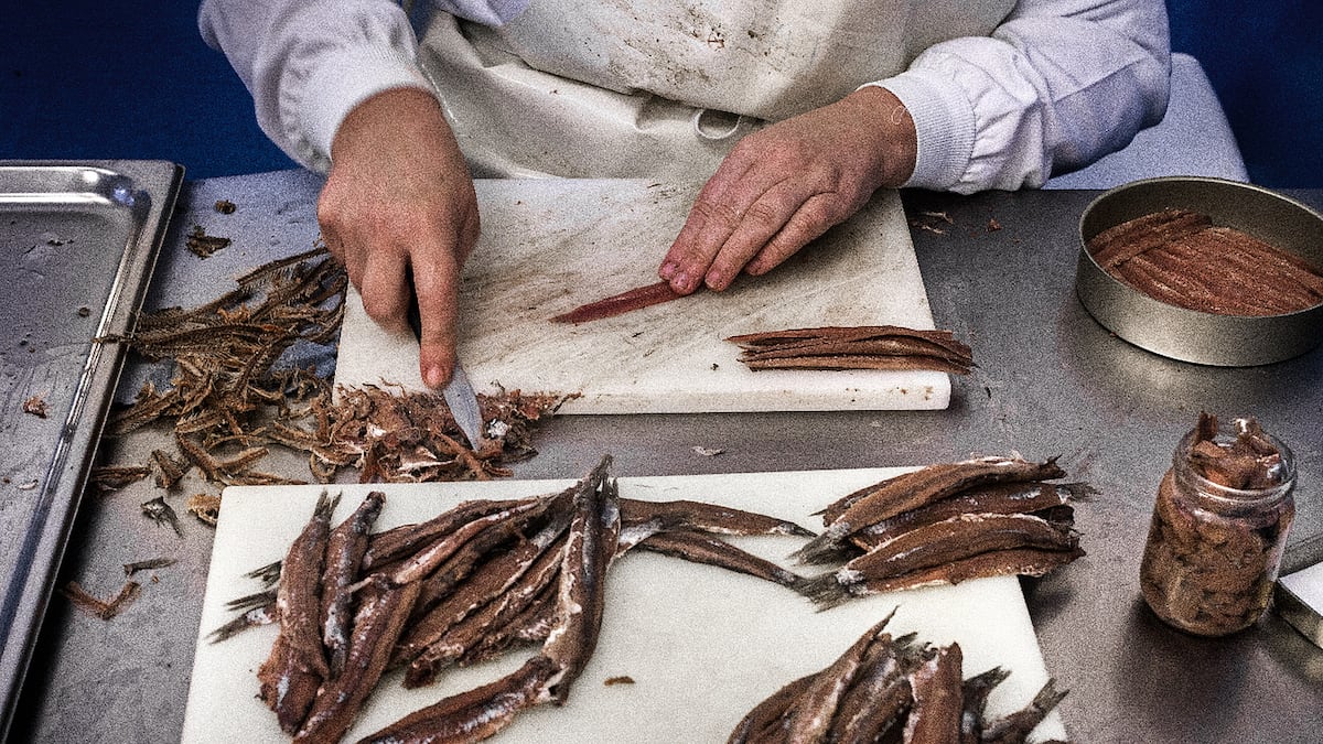 Los salatori italianos se extendieron por toda la costa cantábrica, pero especialmente por Cantabria. Allá enfilamos. Desde Guetaria a Laredo hay 140 kilómetros. Cuatro o cinco más hasta Santoña. Las dos capitales de la anchoa están separadas por la bella ría de Treto. Codesa, en Laredo, es una de las marcas que han apostado por la modernidad, con un envasado de color blanco que remite a la imagen de Apple. Está dirigida por Pepe, Fidel y Tino. Los dos primeros, padre e hijo, se ocupan de localizar el mejor género del Cantábrico; en temporada, controlan telemáticamente dónde se encuentra la flota, qué está pescando y cuándo regresará a puerto. Cuando atraca, están en el muelle de Fuenterrabía, Ondárroa, Guetaria, Gijón o Avilés para ser los primeros en pujar. Exigen que el género haya sido capturado al alba (para que no esté cansado), que no esté aplastado ni roto; no se mezclen partidas ni con otras variedades; esté vivo y puesto en palé con hielo. Y tenga un buen tamaño. “La calidad del producto lo es todo; si no conseguimos lo mejor, echamos el cierre al negocio”. Padre e hijo adquieren 300.000 kilos de anchoa cada año y dan empleo a 60 personas. Tino, cuñado de Pepe y tío de Fidel, es el maestro conservero; el gurú del punto exacto de salado, curado y aceitado, como lo fue durante décadas su padre, Tinín, el número uno en los cincuenta. Según Tino, “la anchoa llegaba antes al consumidor más salada. Ahora, con la cadena de frío, se necesita menos sal para conservarla. Es más dulce, melosa y natural. Y con mejor aceite de oliva”.Codesa está en el polígono La Pesquera, en Laredo, junto a otras seis conserveras. La mano de obra es femenina. Las mujeres las descabezan y evisceran pellizcando con los dedos tras un baño de salmuera. A continuación se introducen en bidones capas (camadas) de anchoas y sal gruesa y se coloca un peso de decenas de kilos sobre esa tarta. Así permanecerán un año. En diciembre, los barriles se descamisan y las anchoas curadas pasan a manos de las fileteras, que las limpian, dividen en dos, extraen la raspa, soban hasta eliminar el mínimo rastro de piel, quitan las últimas espinas con pinzas y las recortan con elegancia. El periplo termina con un buen aceite.