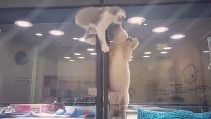 Una tienda de mascotas de Taipei (Taiwán) fue el escenario de la proeza de un pequo felino que saltó desde su habitáculo al de su vecino cachorro
