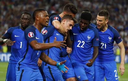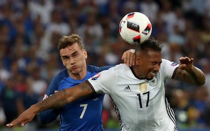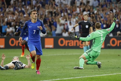 PETER POWELL (EFE)Penalti realizado por el germano Bastian SchweinsteigerMichael Dalder (REUTERS)Los jugadores franceses celebran el gol marcado por Antoine Griezmann.Kai Pfaffenbach (REUTERS)Disparo del alemán Jonas Hector ante la mirada de Moussa Sissoko.Petr David Josek (AP)Blaise Matuidi, Francia, pelea con Thomas Mueller.Matthias Hangst (Getty Images)Antoine Griezmann marca el segundo gol de la selección de Francia.BORIS HORVAT (AFP)Antoine Griezmann tras marcar su segundo tanto.Frank Augstein (AP)El alemán Mesut Oezil defiende un balón ante Samuel Umtiti.FRANCK FIFE (AFP)El alemán Julian Draxler realiza una entrada al francés Moussa Sissoko.ERIC GAILLARD (REUTERS)Lesión de Jerome Boateng.PATRIK STOLLARZ (AFP)El jugador francés Dimitri Payet saluda a su entrenador Didier Deschamps.PASCAL GUYOT (AFP)El equipo galo posa para los fotógrafos.GUILLAUME HORCAJUELO (EFE)Los miembros de la selección germana.TOLGA BOZOGLU (EFE)Una gran bandera alemana en la grada de los aficionados germanos.MOHAMED MESSARA (EFE)Las gradas con los colores azules de los aficionados franceses.GUILLAUME HORCAJUELO (EFE)Los dos equipos alineados antes del inicio de la semifinal.MOHAMED MESSARA (EFE)