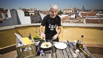 Dicho y hecho. Bajo el sol de su terraza con vistas al Rastro de Madrid, en un momento prepara un apetitoso bacalao desmigado a la miel, una receta sencilla para salir de cualquier apuro. Y aprendida, quizá, en la época en que se llamaba Paspallás y era repartidor de cervezas en Pratos combinados, una de las series semanales más longevas de la historia catódica de España hasta la llegada de Cuéntame, donde encarna al “entrañable y muy gallego” chófer Pepe.