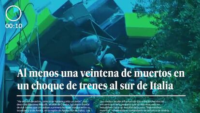 Al menos 23 muertos en un choque de trenes en Italia. Dos convoyes han chocado frontalmente en una zona de vía única en la región de Apulia, en el sur de Italia. El suceso ha dejado al menos 23 muertos y 35 heridos, 18 de los cuales están graves. Las autoridades todavía no han precisado las causas del accidente. Según el diario La Repubblica, desde 2009 se han producido 120 siniestros ferroviarios que han causado la muerte de 74 personas.