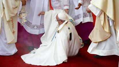 El Papa Francisco se tropieza y sufre una caída durante una misa en Polonia