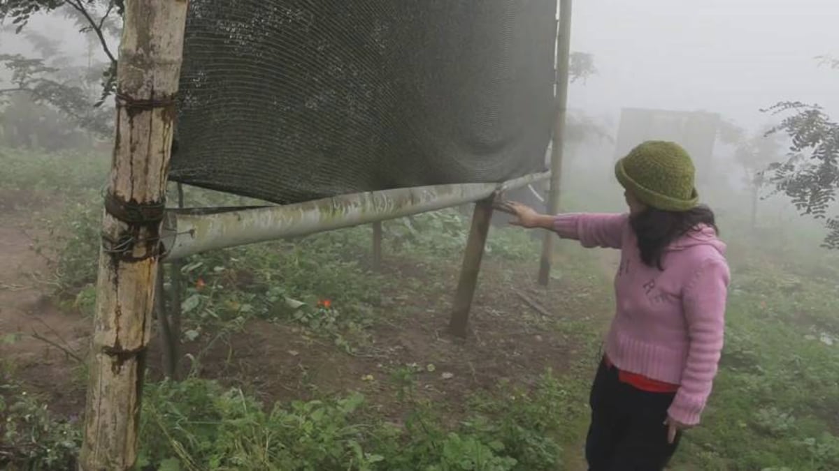 Y, sin embargo, ahora está rodeada de calabazas, patatas, campos de aloe vera y árboles cargados de frutos tropicales. El jardín de Maura es un oasis verde en medio del seco arenal que rodea Lima. La solución se encuentra, como una sombra silenciosa, tras ella: una red de nailon de malla fina de seis por cuatro metros, firmemente tensada entre dos postes de madera. Desde lejos parece más bien una gigantesca red de voleibol. Cuando el viento empuja la niebla baja a través de la red, pequeñas gotas de agua quedan atrapadas en ella, explica Maura. Las gotitas se van juntando para formar gotas de agua más grandes, que se deslizan gracias a la gravedad hacia su destino final: un aljibe. En días favorables –una humedad relativa del 98% no es una excepción en Lima– la red recoge 400 litros de agua. Maura no tiene más que abrir el grifo del aljibe para poner en marcha el sistema de irrigación que ha construido ella misma.