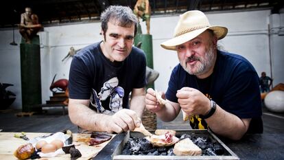 A partir de la concha de una vieira –símbolo del Camino de Santiago–, huevos, jamón, tocino y una trufa de verano, preparamos un plato sencillo y original que Leiro bautiza como el ovo a concha. Encendemos nuestra improvisada cocina con las limaduras de un castaño viejo que acaba de terminar de pulir. “Es algo que hacía hace mucho tiempo en mi estudio, en Cambados: preparaba un fuego con los restos de madera y virutas de después de desbastar las esculturas”, explica. “Y en la ría de Arousa, las conchas las usamos habitualmente para cualquier cosa, porque tienen una forma cóncava que vale tanto para beber como para comer o preparar pintura…”.