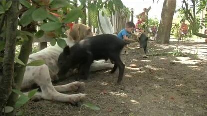 Además de a sus seis cachorros, la perra Linda también da de amamantar a seis cochinillos. Esta hazaña se la debe a su dueño Ignacio Estévez, de Cuba, juntó a ambas especies después de que la madre de los lechones muriera al parir. “Los puse el primer día y ella, con un poco de resabio, le dio y ya a partir de la siguiente semana, ella venía solita y le daba de la teta un poquito”, cuenta. Ahora, su casa en Playa Larga se ha convertido en un lugar de peregrinaje donde los vecinos se detienen para ver esta extraña adopción.