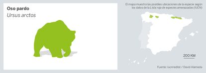 El oso pardo no está en peligro de extinción en todo el mundo, pero sí en España. En su momento anduvo por doquier en Eurasia, pero conforme la población humana aumentó, se redujeron sus hábitats. Su presencia en Europa ha quedado limitada a reductos, normalmente montañosos y en pendientes elevadas. Su principal amenaza es otro mamífero: el homo sapiens sapiens, que ha ido acabando con los robledales y los hayedos que le proporcionan los frutos secos y le mantienen en buen estado fisiológico.