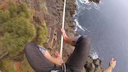 Un funambulista ha grabado una peripecia a 32 metros de altura sobre unos acantilados en Tasmania, Australia. El deportista extremo, Ryan Robinson, lo ha registrado con una cámara en su cabeza y muestra cómo se arriesga la vida, ya que no lleva ningún tipo de arnés de seguridad. No es la primera vez que este atleta, que se autodefine como un "guerrero ninja americano", registra alguna de sus peripecias, ya que en su perfil de Instagram difunde a menudo alguna nueva imagen de vértigo. En este caso ha sido la empresa fabricante de cámaras GoPro la que lo ha difundido.
