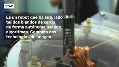 Paralelamente, un grupo de cirujanos americanos ha ideado un robot que ha operado a un cerdo. En concreto, ha realizado la sutura entre dos fragmentos de intestino, lo que se conoce como anastomosis. Intervenir en tejidos blandos es un auténtico reto “por causa de la limitaciones tecnológicas, incluyendo la falta de sistemas de visión que puedan distinguir y seguir los tejidos que hay que operar en entornos quirúrgicos dinámicos”, explican en los autores del experimento en el artículo, publicado este año en Science Transational Medicine. El aparato se denomina STAR, e incluye dos sistemas de visión (en 3D y con fluorescencia) y lo más importante, un algoritmo de sutura que ha aprendido de los mejores cirujanos. Cuando se comparó cómo realizaba su operación STAR frente a la completada por los médicos por laparoscopia y con robot, el nuevo autómata lo hizo mejor.