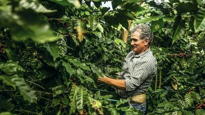 EDGAR FERNÁNDEZ recoge a mano las cerezas de los árboles de café que tiene en su hacienda, a dos horas en coche de San José, la capital de Costa Rica. Con suma destreza, cuidado y una asombrosa velocidad separa los frutos, de color predominantemente rojo (también hay tonos verdes y amarillos), depositándolos en una cesta anudada a su cintura. A más de 1.200 metros de altitud, a veces recolecta en laderas escarpadas, en la tierra que compró hace 30 años. “En esta finca crecen 47 especies de árboles. Aquel floreado tiene unos aromas fenomenales: se llama estoraque. Abejas y pájaros acuden a chupar su miel. También hay jorcos, que plantamos nosotros, y este otro es un boribo…”, relata.