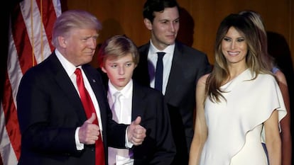 Donald Trump llega a la Casa Blanca con una familia formada tras tres matrimonios, dos divorcios y con un resultado de cinco hijos. El menor de ellos, Barron Trump, de 10 años, nació de su unión con Melania, y es el único de sus vástagos que se mudará a la residencia de la avenida de Pensilvania de Washington. El pequeño, aunque ha posado en alguna ocasión para reportajes junto a su familia, se hizo famoso la noche del martes por estar a la izquierda de su padre cuando acababa de ser proclamado ganador de las elecciones a la presidencia de EE UU. Su cara de sueño y sorpresa no pasó inadvertida.