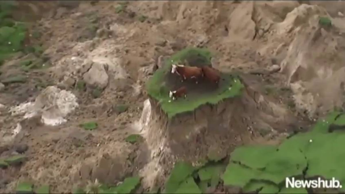 La imagen de tres vacas atrapadas en un montículo se ha convertido en el símbolo que representa las consecuencias del terremoto de 7.8 que este domingo azotó Nueva Zelanda. El vídeo, publicado por el medio neozelandés Newshub, muestra a tres reses atrapadas en lo alto de un pequeño terreno en medio de un paisaje devastado por el seísmo. Según informa este mismo medio, los ganaderos de ese país insular llevaban varios años intentando superar una sequía que estaba afectando a la producción de la leche. Después de este domingo, alrededor de 30 granjas de la zona de Kaikoura, una de las más afectadas por el terremoto, han paralizado indefinidamente el ordeño de sus animales y un número indefinido del resto del país retrasarán su producción.