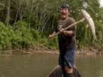 En el río Rotuno, uno de los cientos de vías fluviales que bañan el territorio de Sarayaku, una parte de la población se reúne en las épocas de vacaciones para llevar a cabo la pesca colectiva de subsistencia. Miles de peces son apresados en estas capturas realizadas con barbasco. Los animales, que huyen río abajo de la sustancia narcótica, encuentran su fin al toparse con el dique construido por los indígenas el día anterior a la pesca. Es entonces cuando los habitantes de Sarayaku llenan sus cestos y canoas con decenas de pescados, para más tarde limpiarlos de escamas y vísceras. Finalmente, proceden a ahumarlos para que se conserven durante al menos dos meses, tiempo en el que servirán de alimento para las familias.