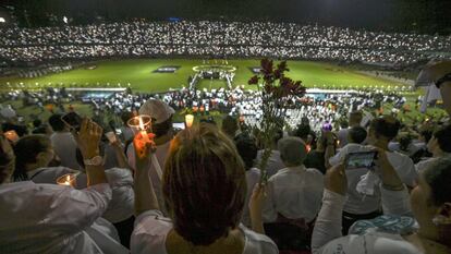 Miles de personas homenajearon este miércoles al Chapecoense en el estado Atanasio Girardot de Medellín y a las demás víctimas del accidente aéreo que dejó 71 muertos este martes cerca de la ciudad colombiana. "Campeones son todos los que perdieron la vida, nunca los olvidaremos", rezaba una de las pancartas exhibidas entre la multitud de personas, en su mayoría vestidas de blanco y con banderas colombianas y brasileñas. En el exterior, cientos de personas que no consiguieron entrar en el estado, depositaron flores y encendieron velas en las aceras. El acto congregó a los ministros brasileños de Relaciones Exteriores, José Serra, y de Cultura, Roberto Freire; al alcalde de Chapecó, Luciano Buligon; a su homólogo de Medellín, Federico Gutiérrez; al gobernador del departamento colombiano de Antioquia, Luis Pérez; y a representantes de la Confederación Suramericana de Fútbol (Conmebol), del Atlético Nacional y de otros clubes.