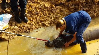 Salvan a una tortuga protegida de morir atrapada en una tubería