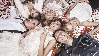 Tampoco se conocía entre sí el cuarteto formado por la escritora Gabriela Ybarra, la modelo Iveta Sivakova y los actores Álvaro Cervantes y William Miller. Iveta se planta en la escalera, el lugar escogido para la foto, con un vestido rosa palo y unos tacones con los que supera el metro con noventa de altura. A su lado, hasta William Miller parece bajito. Se impone un cambio de zapatos. Mientras, las actrices Melina Matthews y Miriam Giovanelli pasan por maquillaje, y los directores Javier Calvo y Javier Ambrossi se entretienen en el vestuario. La estilista ha elegido un par de trajes para ellos. “¿Podemos probarnos unas chaquetas de lentejuelas?”. Enfundado con el look final, Javier Calvo comenta, medio en broma medio en serio: “Me siento como en Noche de fiesta”.