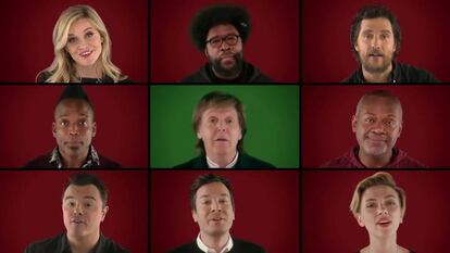 Al más puro estilo familia Brady, los actores Matthew McConaughey, Reese Witherspoon o Scarlett Johansson aparecen cantando junto a Fallon y la banda de su programa The Roots el villancico Wonderful Christmas Time. A ellos también se unen el actor y animador Seth MacFarlane y la cantante y compositora Tori Kelly. Todos ellos han puesto voz a los personajes animados de la película ¡Canta!, una comedia musical animada que se estrena en Estados Unidos la semana que viene. Así que tras demostrar sus dotes musicales en la gran pantalla Jimmy Fallon les ha querido poner a prueba con un villancico, en el que también aparecen sus personajes. McConaughey, por ejemplo, le pone voz al koala Buster Moon y la actriz Reese Witherspoon, al cerdo Rosita. Quien también hace una aparición estelar en el vídeo de un minuto y medio de duración es, como no podía ser de otra manera, el compositor del villancico, de 1986: el cantante Paul McCartney.