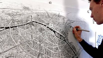 Un lápiz traza unas líneas sobre una lámina en blanco: el recorrido del Sena, los bulevares, la Torre Eiffel… En ese momento es difícil imaginarlo, pero minutos después el artista Thomas Dartigues levanta su boceto, lo cuelga en un soporte vertical y cambia el lápiz por un bolígrafo negro del que sale un plano de París con un nivel de detalle sorprendente. Un vídeo acelerado muestra en minutos un proceso que puede durar días. Dartigues, conocido como Decktwo, ideó el proyecto Generation Paris como homenaje a la ciudad que ha sido fuente de inspiración de sus dibujos en la última década. Y también una suerte de talismán: la edición limitada que puso a la venta está agotada mientras en webs y redes sociales no deja de recibir alabanzas por su trabajo.