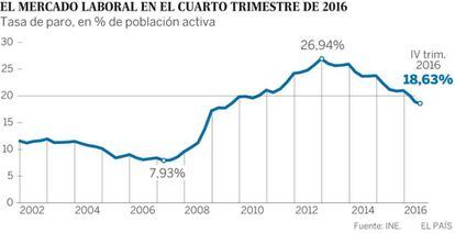 La tasa de paro acabó 2016 en el 18,6%, el nivel más bajo en siete años. Esto es casi nueve puntos por debajo del máximo que tocó a comienzos de 2013 (27,2%). El número de parados registrados fue de 4.237.800, un dato que hay que remontarse también a la segunda mitad de 2009 para ver una cifra similar. A pesar de esta tendencia positiva gracias a la evolución del mercado laboral, la recuperación se ha ralentizado. El incremento en los últimos 12 meses del empleo ha sido del 2,29%, un punto porcentual por debajo del ritmo que mantenía a inicios de 2016. Este es el porcentaje de crecimiento más bajo desde finales de 2014.