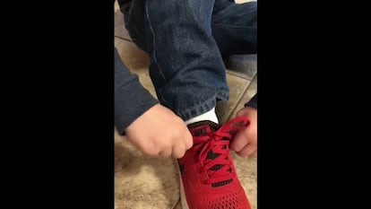 Así lo prueba Colton, un niño de 5 años que, tendido en el suelo, muestra cómo se las apaña para atar los cordones de sus zapatillas de una forma que le resulta más sencilla que las fórmulas clásicas. Consiste en introducir el extremo de cada cordón en el último agujero de su lado, formando una especie de lazada que hace el nudo más resistente y sin molestos sobrantes.