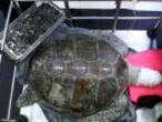 Omsi es una tortuga marina verde que tenía dificultades para nadar a causa del peso de las monedas y otros objetos que había tragado.