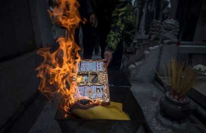 Un hombre quema billetes falsos como muestra de respeto a sus ancestros durante la celebración anual de 'Quingming', o el 'Día de barrer tumbas', en un cementerio público de Shanghái, (China), el 4 de abril de 2017. Las familias chinas queman ofrendas de papel, se usan réplicas de dinero, coches y ropa.JOHANNES EISELE (AFP)Un hombre muestra sus respetos en un cementerio de Malasia con las Torres Petronas de fondo, durante la festividad 'Qingming' en Kuala Lumpur, el 4 de abril de 2017.MANAN VATSYAYANA (AFP)Un cupcake visto sobre una lápida en un cementerio de Kuala Lumpur (Malasia) el 4 de abril de 2017, durante la festividad de 'Qingming'.MANAN VATSYAYANA (AFP)Una mujer pinta los grabados de una lápida en la festividad anual de 'Qingming' o 'Día de barrer tumbas', en un cementerio público de Shangai (China), el 4 de abril de 2017.JOHANNES EISELE (AFP)Cientos de personas portan réplicas de dinero para mostrar sus respetos a sus ancestros durante la celebración del 'Qingming' en Shangai (China).JOHANNES EISELE (AFP)Estudiantes tibetanos de Jiangsu Nantong Minority Middle School depositan flores en un cementerio de mártires revolucionarios por la festividad de 'Qingming', en la provincia de Jiangsu, (China).STR (AFP)Un joven reza frente a una lápida en el 'Día de barrer tumbas' o 'Qingming' en un cementerio público de Shangai, (China).JOHANNES EISELE (AFP)Ciudadanos de origen chino en Malasia también celebran la festividad de 'Qingming'. En la imagen, una mujer fotografía con su teléfono móvil el cementerio de Kuala Lumpur, el 4 de abril de 2017.MANAN VATSYAYANA (AFP)Durante el 'Qingming' los familiares ofrecen alimentos a sus seres queridos así como réplicas de teléfonos móviles, ropa o dinero, para luego ser quemados.JOHANNES EISELE (AFP)Una pareja de ancianos chinos en Malasia lleva sus ofrendas a la lápida de sus ancestros durante la festividad de 'Qingming' en Kuala Lumpur, el 4 de abril de 2017.MANAN VATSYAYANA (AFP)Miles de personas visitan los cementerios durante la festividad 'Qingming', también conocida como 'Día de barrer tumbas', el 3 de abril de 2017, en la provincia china de Shangong.CHINA STRINGER NETWORK (REUTERS)