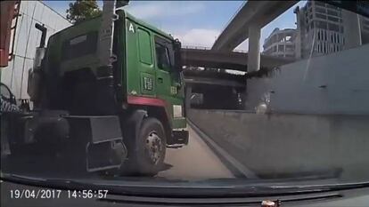 El vehículo, que circulaba por una avenida en Singapur, fue embestido contra la pared de un túnel por un camión que invadió su carril. La cámara del salpicadero de Eddie Wong, el dueño del vehículo, captó el momento en el que un camión de grandes dimensiones colisiona contra su coche al querer incorporarse inesperadamente a su carril. Wong, que resultó herido leve a pesar de lo aparatoso del accidente, colgó el vídeo en sus redes sociales asegurando que se había salvado "milagrosamente".
