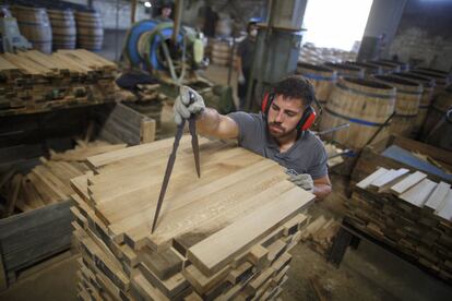 Antonio Paez suele utilizar roble europeo para fabricar sus barriles. Tras ello, maduran el vino de Jerez durante dos años, antes de exportar la mayor parte de los barriles a los productores de whisky de Irlanda y Escocia. En la imagen, un trabajador utiliza una máquina durante la producción de un barril de roble.Pablo Blázquez Domínguez (Getty)Un trabajador carboniza el interior de un barril mientras lo monta con agua y fuego.Pablo Blázquez Domínguez (Getty)Dos hombres comienzan a montar uno de los barriles de la tonelería de Antonio Paez.Pablo Blázquez Domínguez (Getty)La madera utilzada se deja secar en el exterior junto a los barriles ya elaborados.Pablo Blázquez Domínguez (Getty)Un trabajador mide y selecciona la madera de roble para el montaje de las barricas.Pablo Blázquez Domínguez (Getty)Un trabajador aprovecha el fuego para calentar su bocadillo.Pablo Blázquez Domínguez (Getty)Dos trabajadores colocan un barril en una máquina durante el proceso de producción del mismo, en la tonelería Antonio Paez.Pablo Blázquez Domínguez (Getty)Un láser dibuja el logo de la empresa quemando la madera de un barril.Pablo Blázquez Domínguez (Getty)Un trabajador repara un viejo barril.Pablo Blázquez Domínguez (Getty)