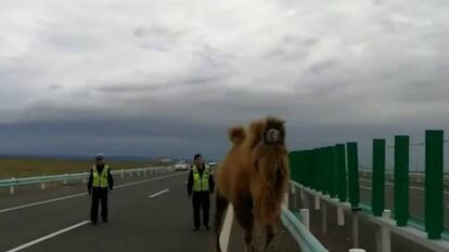 Los conductores que circulaban por una carretera a en la ciudad de Karamay, en la región de Xinjiang, al noroeste de China, se encontraron con un curioso obstáculo en mitad de la vía. Dos camellos que parecían estar desorientados han entorpecido el paso de los vehículos hasta tal punto, que los agentes de policía tuvieron que paralizar la circulación. Los animales iban de izquierda a derecha de la carretera y la policía ha tardado más de media hora en sacarlos de la vía y reestablecer el tránsito.