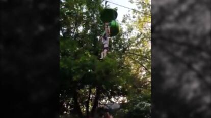 Lo que iba a ser un día de ocio y diversión en el parque de atracciones Six flags amusement park de Queensbury, en Nueva York (Estados Unidos), casi acaba en tragedia. Una de las usuarias, de 14 años, quedó suspendida de una cabina a unos siete metros y medio de altitud. La menor intentaba agarrarse al aparato para no caer, mientras una docena de personas la esperaba en el suelo para frenar su impacto. "Está bien, suéltate. Te cogeré, pequeña", le gritó uno de los clientes, como se observa en este vídeo. La chica fue trasladada hasta el hospital Albany medical center, donde fue atendida de heridas leves. Desde el parque de atracciones han asegurado que la atracción contaba con los requisitos y permisos de seguridad, según informan medios locales.