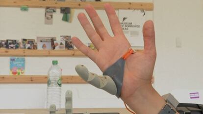 Partiendo de esa idea, diseñó un dispositivo consistente en un dedo pulgar que se puede añadir a la mano junto al meñique. El dedo, impreso en 3D, se controla de forma inalámbrica con movimientos de los pies. Dos motores tiran de una serie de cables para ejecutar los movimientos.