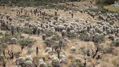 Para llegar a un páramo hay que subir más allá de los 2.000 metros de altura y enfrentarse en el mismo recorrido al frío, la lluvia o el calor intenso. La mayoría de estos ecosistemas se encuentran en la cordillera de los Andes, el 49% en Colombia, con excepciones en Costa Rica y África. El suelo es un colchón de agua que han dejado las nubes. La vegetación es achaparrada, de verdes intensos. Solo los frailejones más antiguos asoman sus cabezas peludas por encima del resto. Estas plantas salpican el paisaje como si fueran frailes encapuchados en mitad del campo, de ahí su nombre. Son los almacenes hídricos de Colombia.