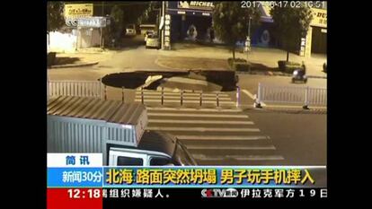 Un conductor se ha precipitado en un gran socavón en una carretera de China por ir mirando el teléfono móvil mientras conducía. Los hechos ocurrieron el jueves en la ciudad de Beihai, situada al sur del país. La carretera se hundió poco antes de que él pasara pero, al ir distraído, no se percató del enorme agujero que se había tragado el carril. El hombre salió ileso del accidente y dos conductores que se pararon a socorrerle acordonaron la zona para evitar nuevos accidentes. Las autoridades municipales están investigando la causa del hundimiento.