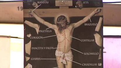 La Ertzaintza, por orden judicial, ha retirado el Cristo de la discordia. Formaba parte de la decoración de una caseta de las fiestas de Bilbao, bajo el lema 'Carnicerías Vaticanas', algo que no ha sentado demasiado bien a la Iglesia. Los responsables de la caseta defienden su decorado alegando que sólo es un acto "contra la ley carnívora" y acogiéndose a la libertad de expresión. Libertad de expresión respaldada por muchos y criticada por otros tantos. Los festeros piden respeto, así como el alcalde de la ciudad.