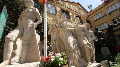 Hay un segundo gran vestigio del franquismo en la ciudad: el monumento a los Héroes de España. Fue erigido en 1941 tras el derribo del quiosco La Peña, el que fue el Café Gijón de Melilla, donde se reunían los intelectuales, artistas y periodistas para hacer tertulias. "Franco siempre consideró el 18 de julio como la fecha del alzamiento porque fue la etapa que él protagonizó. La ciudad levantó este monumento al 17 de julio por sufrir el trauma de no tener el reconocimiento de Franco de que el alzamiento se había producido en esta ciudad un día antes", afirma Vicente Moga, el director del Archivo Histórico de Melilla. El Ayuntamiento defiende que el grupo escultórico en bronce es “de calidad artística” y que pertenece a una zona considerada Bien de Interés Cultural, lo cual “es razón suficiente para su conservación”. No obstante, el catálogo admite la “importante carga ideológica” del conjunto de piedra y recomienda mantener solo la estatua de bronce.
