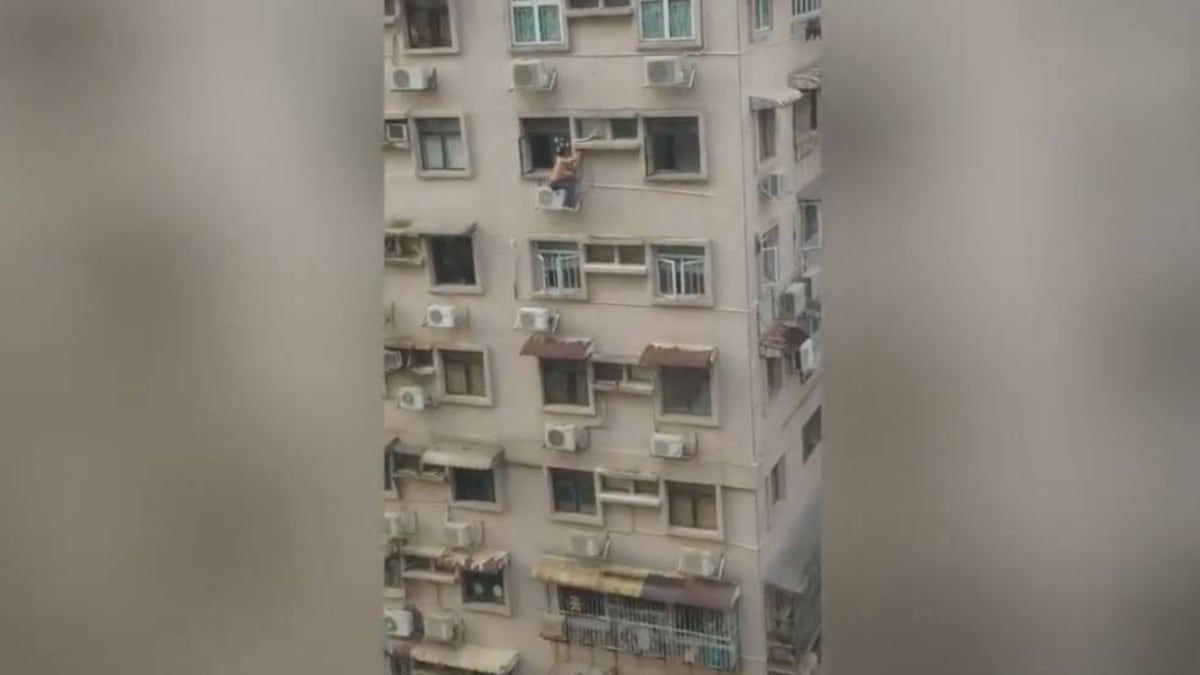 Dos hombres en Macao, China, intentan arreglar su aire acondicionado a una veintena de pisos de altura