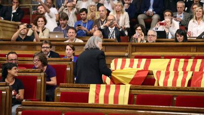 La diputada de Podem (la rama catalana de Podemos) Àngels Martínez ha retirado las banderas de España que han dejado los diputados del Partido Popular en los escaños, junto a varias senyeres, después de que estos, junto a los de Ciudadanos y PSC, abandonasen este miércoles el pleno del Parlament antes de la votación de la ley del referéndum como señal de protesta. Ángels Martínez está integrada en el grupo parlamentario de Catalunya Sí que es Pot, que incluye también a diputados de Iniciativa y otras formaciones.